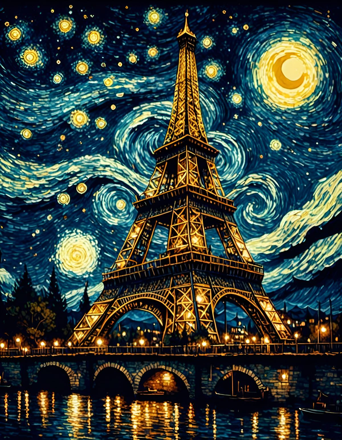 A vibrant image showing the Eiffel Tower under a swirling, starry sky reminiscent of Van Gogh. The artwork features deep, complex colors in a hyperreal fine art style.