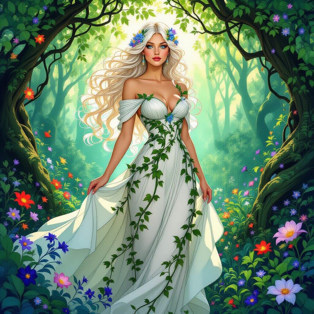 A regal woman in a floral gown stands in an enchanted forest filled with glowing flora. The image is rendered in an Art Nouveau style, featuring intricate details and a rich color palette.