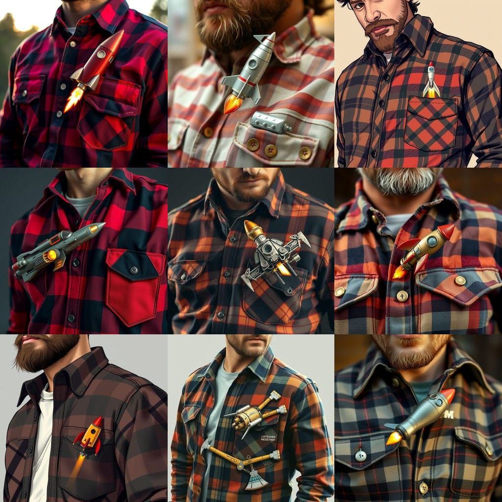 This image depicts a miniature rocket ship taking flight from the pocket of a man's lumberjack shirt. The scene is rendered with intricate detail.
