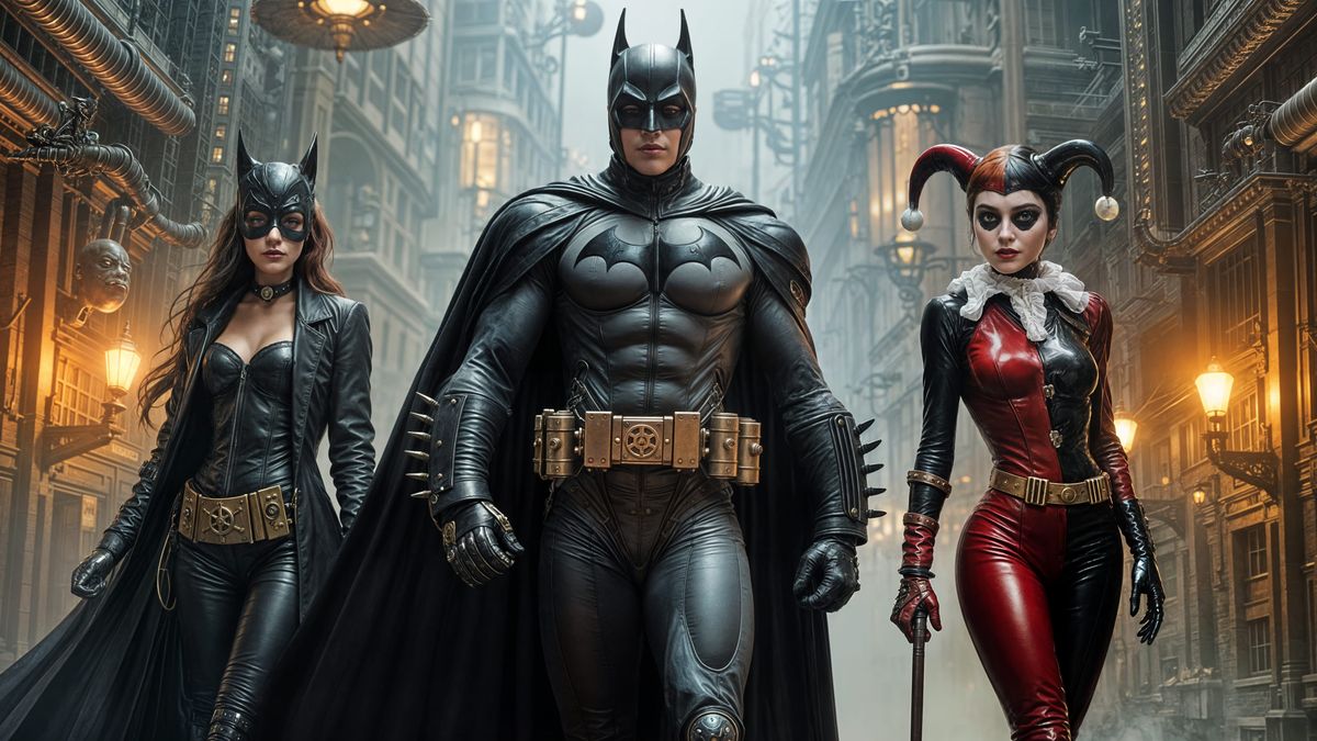 This image captures a Victorian-era Gotham City in a steampunk setting, featuring iconic characters from the DC universe, including a sophisticated Catwoman and the Caped Crusader, set against a backdrop of industrial machinery and mystical energy.