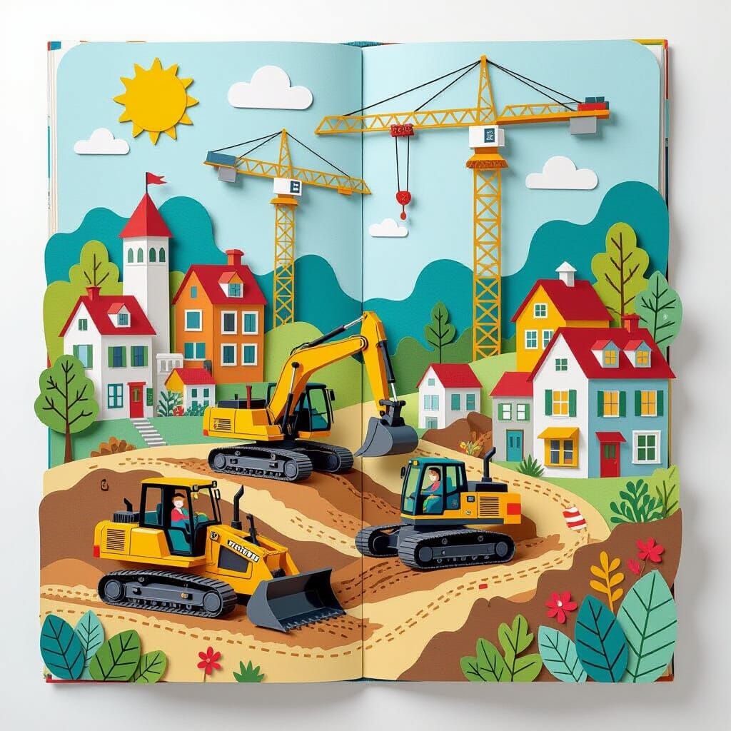 Create your own construction and town-themed pop-up book images with our free AI image generator.
