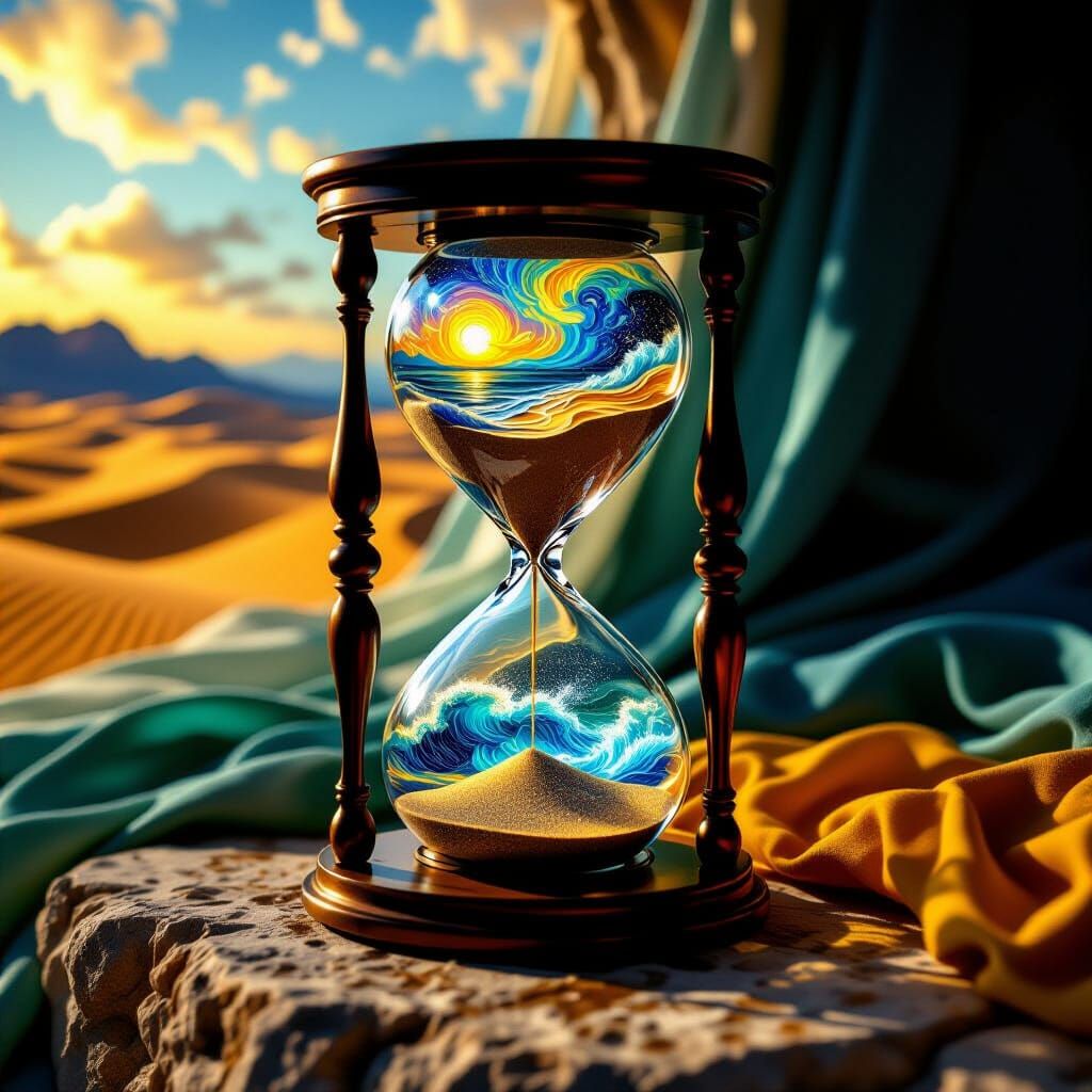 This image showcases a high-definition double exposure of a glass hourglass filled with desert and ocean scenes. It features dynamic light, shadows, and a vintage mystical atmosphere, created with expressive brushstrokes.