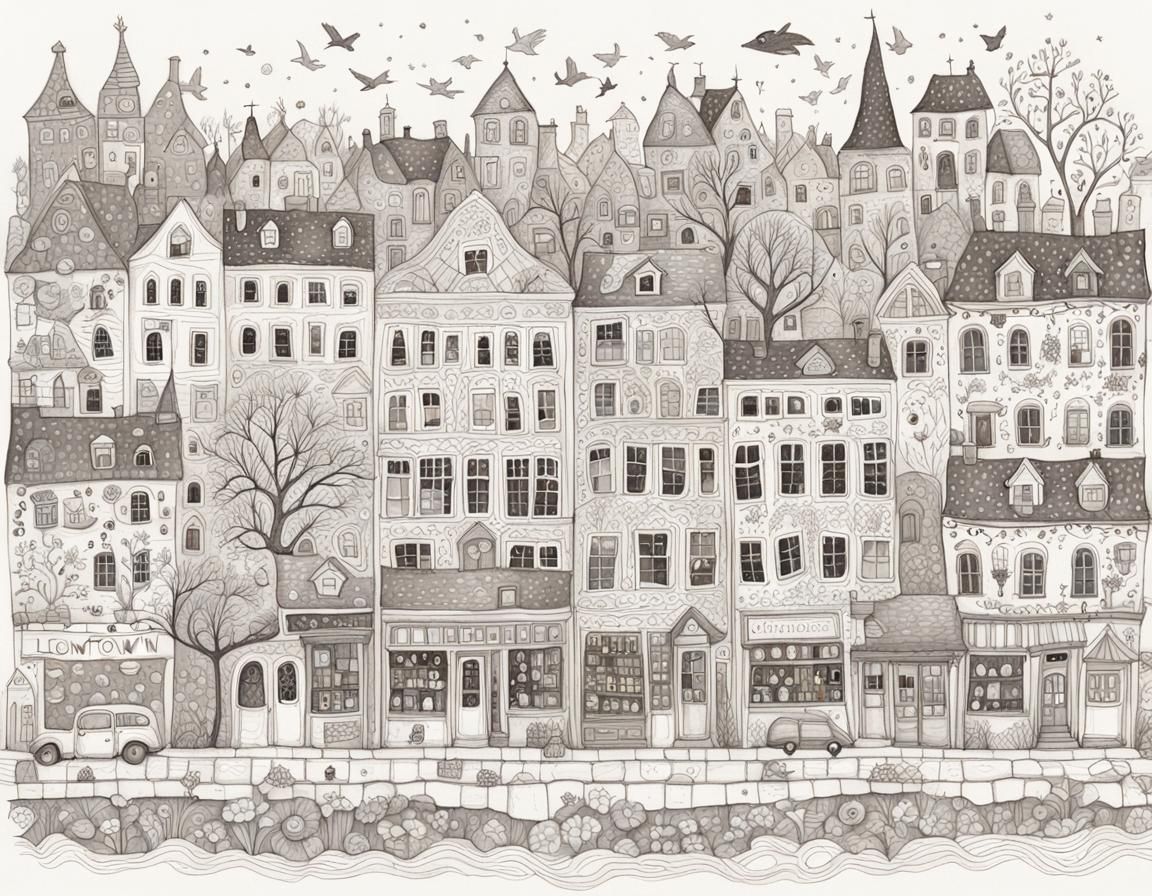 This image shows a charming little town depicted in intricate detail, rendered in a playful doodle style with meticulous lines and textures.