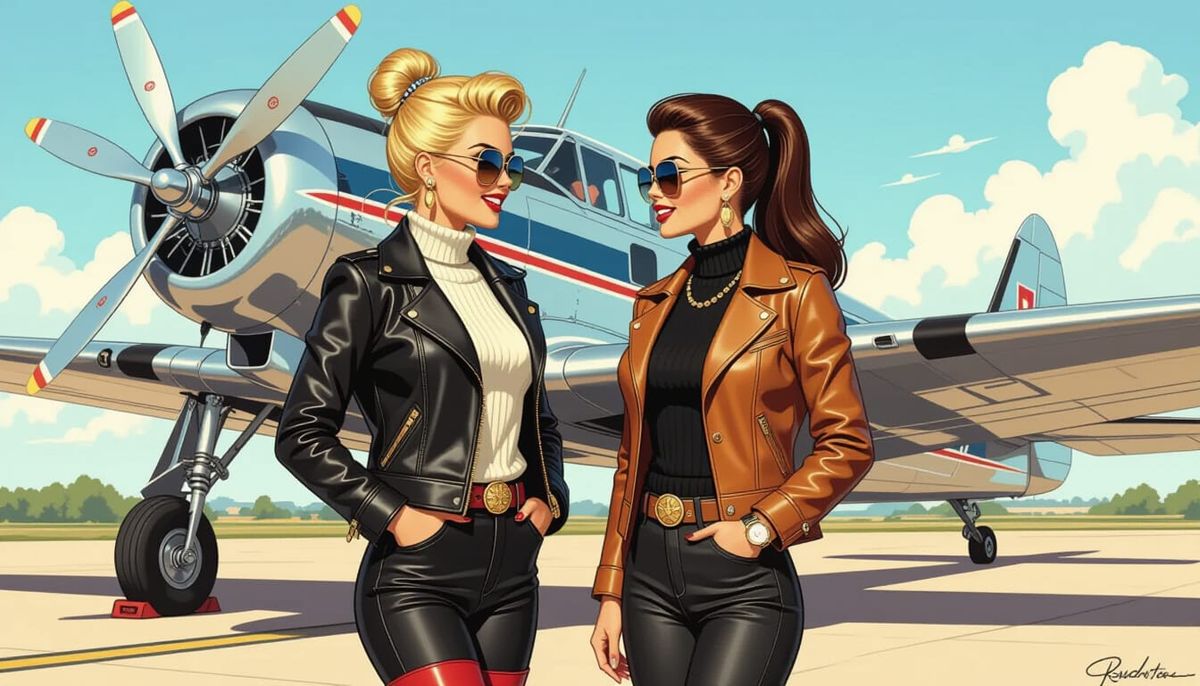 This image shows two beautiful women pilots in leather jackets standing in front of a vintage airplane. They are wearing sunglasses and pilot's watches and are talking with gestures. The style resembles comic book art.