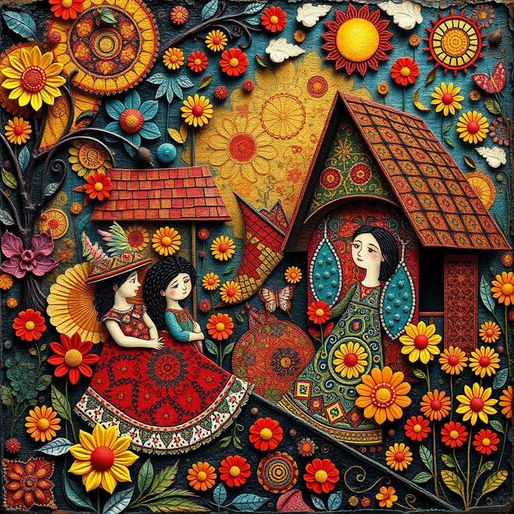 This vibrant scene showcases a fantastical Lithuanian folk art world, blending traditional patterns with abstract and surreal elements in a stunning, high-definition digital art piece.