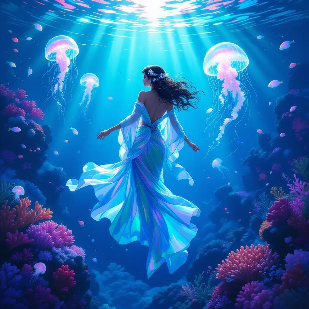 A digital painting of a Nereid in iridescent robes swimming through a bioluminescent underwater world. The artwork features vibrant colors, soft lighting, and a dreamlike quality.