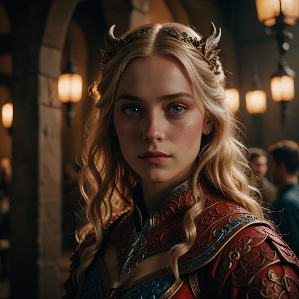 This image shows a striking portrait of a blonde, blue-eyed Welsh woman in elaborate costume. Golden accents and deep shadows give the picture a cinematic, film-like quality.