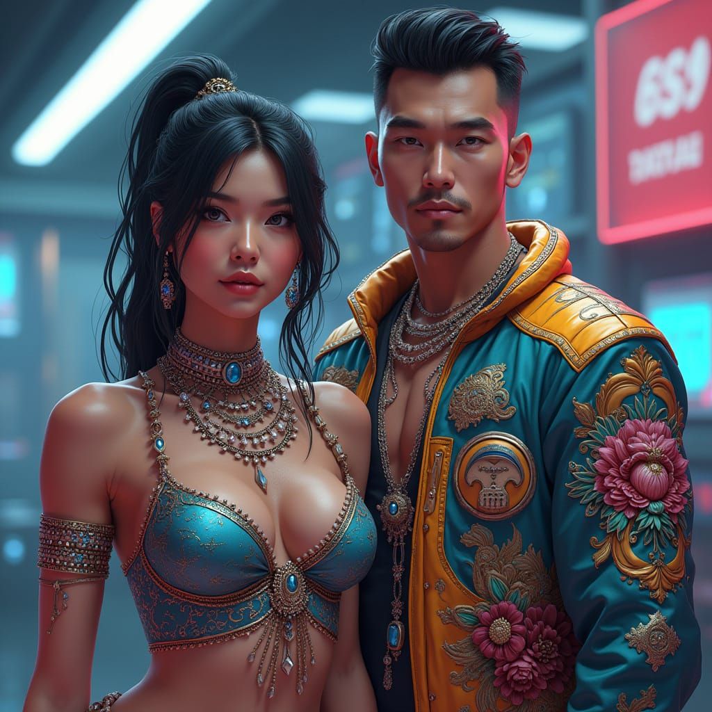 This image shows a beautiful woman and muscular man adorned with futuristic jewelry and colorful clothing. The hyperrealistic rendering captures precise textures and vibrant neon colors in a sleek, high-tech environment.