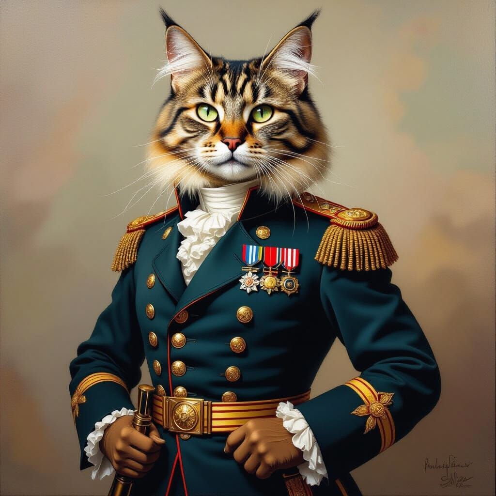 A striking picture of an anthropomorphic cat general in formal military attire, standing in a dramatic pose. The image features ultrarealistic details, soft fur, and vibrant colors, as a matte canvas painting.