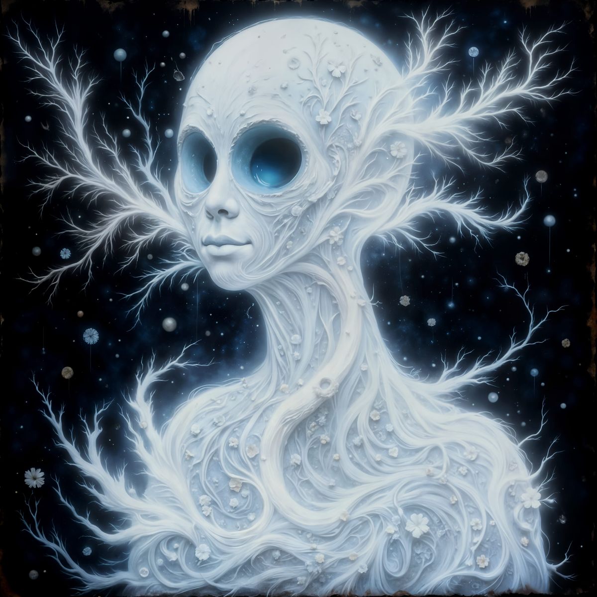 This image captures a hauntingly beautiful spectral figure, rendered with the intricate detail of cloisonne art and an otherworldly glow.