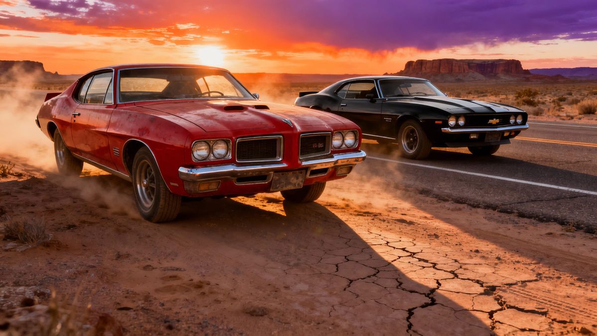 This image shows a hyperrealistic lineup of classic 1970s muscle cars like a GTO and Camaro on a dusty desert highway during a vibrant sunset. Cinematic lighting highlights chrome and textures.