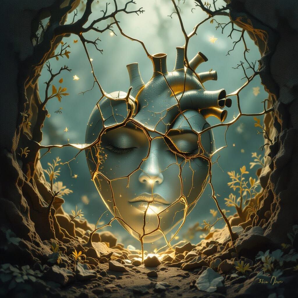 A symbolic surrealist artwork depicts a broken heart mended with golden veins, glowing softly on an indigo backdrop. Evokes emotional depth with chiaroscuro lighting.
