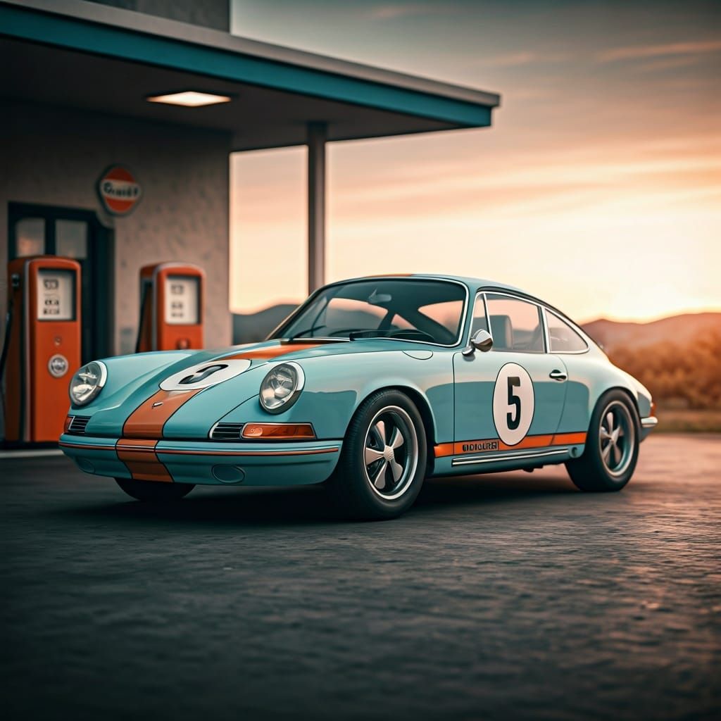 A vintage Porsche with Gulf livery parked by a gas station. The image evokes a nostalgic 1970s motorsport aesthetic with warm lighting, subtle lens flare and photorealistic rendering.