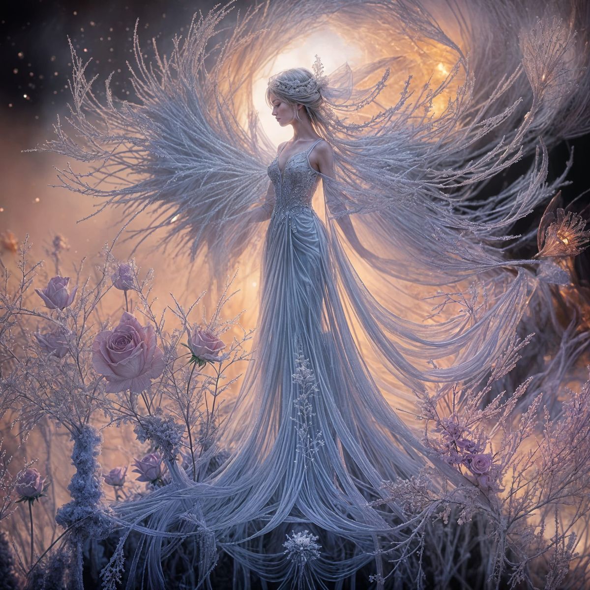 This image showcases a bouquet of roses covered in frost, with petals shimmering like glass. The artwork features detailed filigree frost patterns and a dreamlike, luminous atmosphere, presented in a hyperrealistic digital matte painting style.