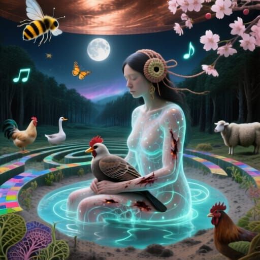 This image shows a sculptor within a massive spiral bio-art sculpture. It features a mystical, surreal collage style with botanical elements and ethereal lighting.