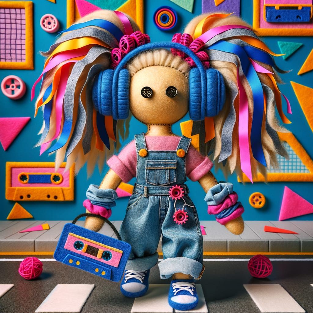 A vibrant image of a felt doll in 90s attire walking down a geometric street. The doll has cassette tape ribbons for hair styled with cassette cog scrunchies, and wears oversized headphones.