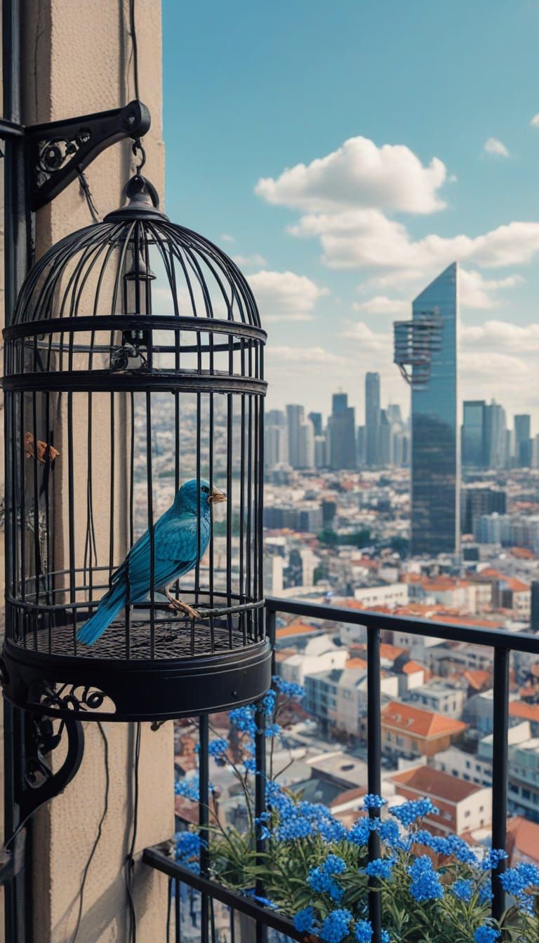 This image shows a robotic bird perched in a cage adorned with blue flowers, set on a balcony overlooking a futuristic city. The artwork captures a blend of nature and technology.