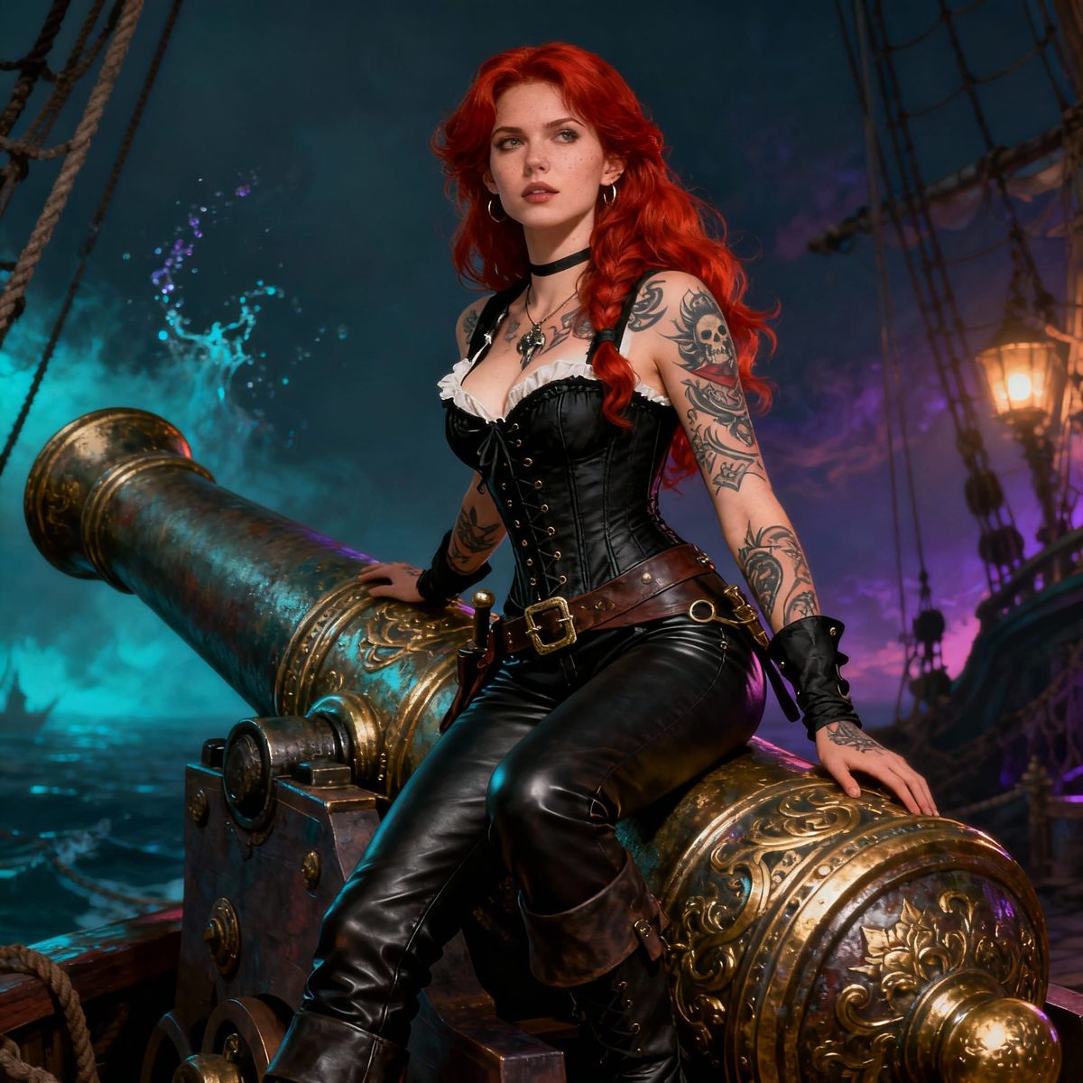 This hyper-realistic image depicts a tattooed, redheaded pirate in a corset, straddling an ornate cannon. Rendered with deep, fantastical colors and intricate detail, it has a splash screen aesthetic.