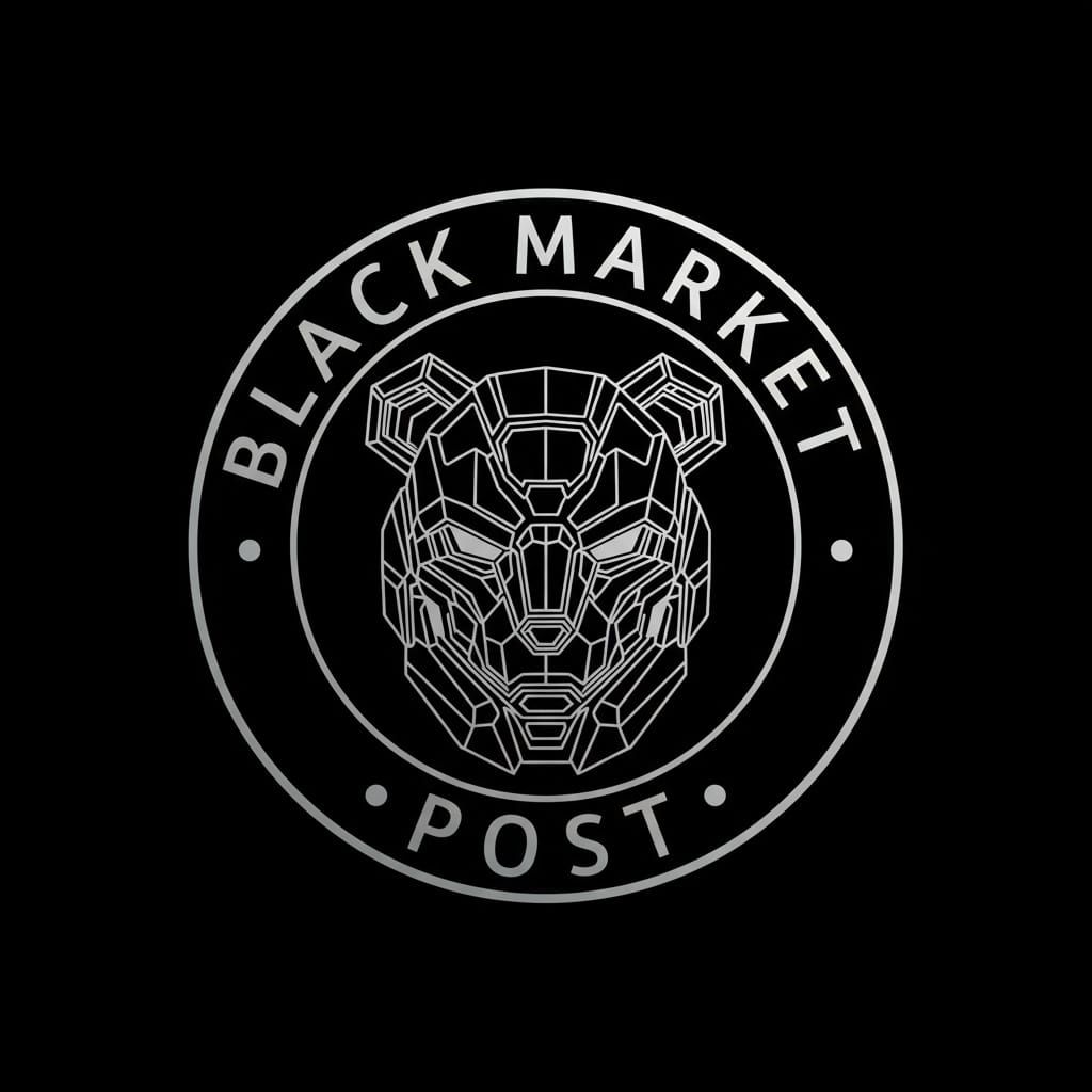 This image features a minimalist, elegant vector logo for 'Black Market Post'. It's a circular postmark with a detailed silhouette at the center, rendered in a monochromatic black and silver scheme.