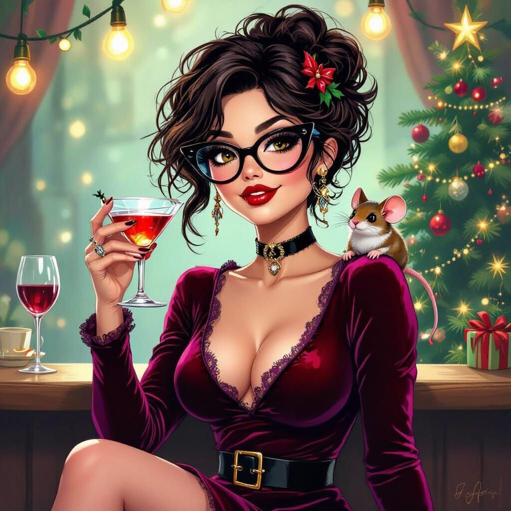 A humorous cartoon sketch of a woman in a velvet outfit with disheveled hair, holding a martini. A colorful mouse sits on her shoulder with a festive Christmas tree behind her.