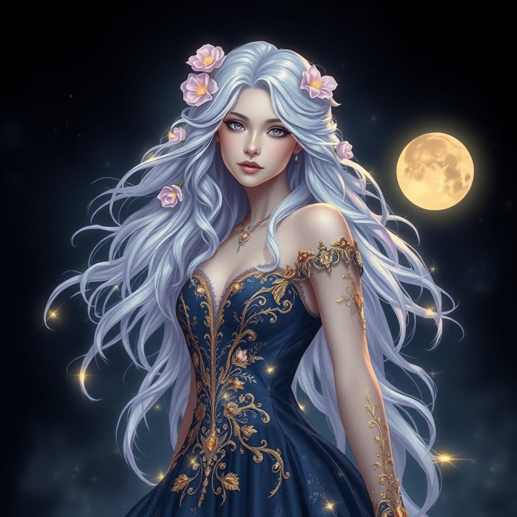 A mystical sorceress of dreams bathed in soft lunar light, surrounded by iridescent flowers and shimmering threads, exuding an otherworldly aura in a stunning Art Nouveau-inspired evening gown.