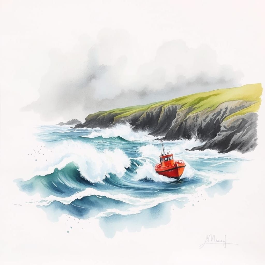 A vibrant watercolor painting capturing a dramatic Cornish coastline with turbulent waves. The image features a lifeboat battling the storm under a threatening sky, all against a white backdrop.