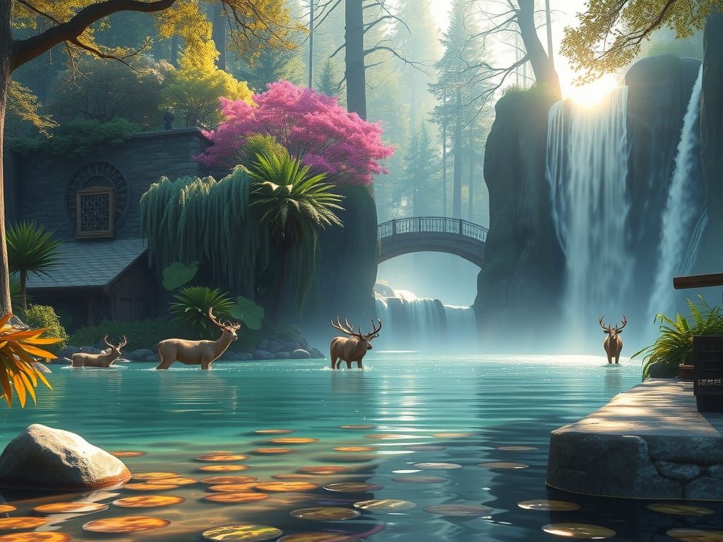 Eine atemberaubender Wasserfall in einer fantasievollen Umgebung. Ein blühender Wald mit wilden Tieren die am Wasserfall ihren Durst stillen. Die Sonnenstrahlen glitzern auf dem Wasser.