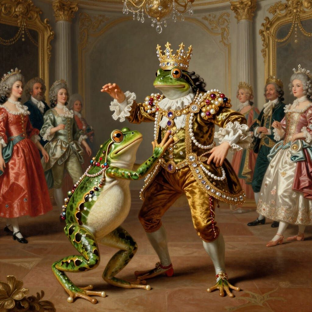 This image depicts a royal frog gala in a grand palace ballroom, featuring a crowned frog king dancing. Painted in a detailed, opulent Baroque style with dramatic lighting and rich colors.