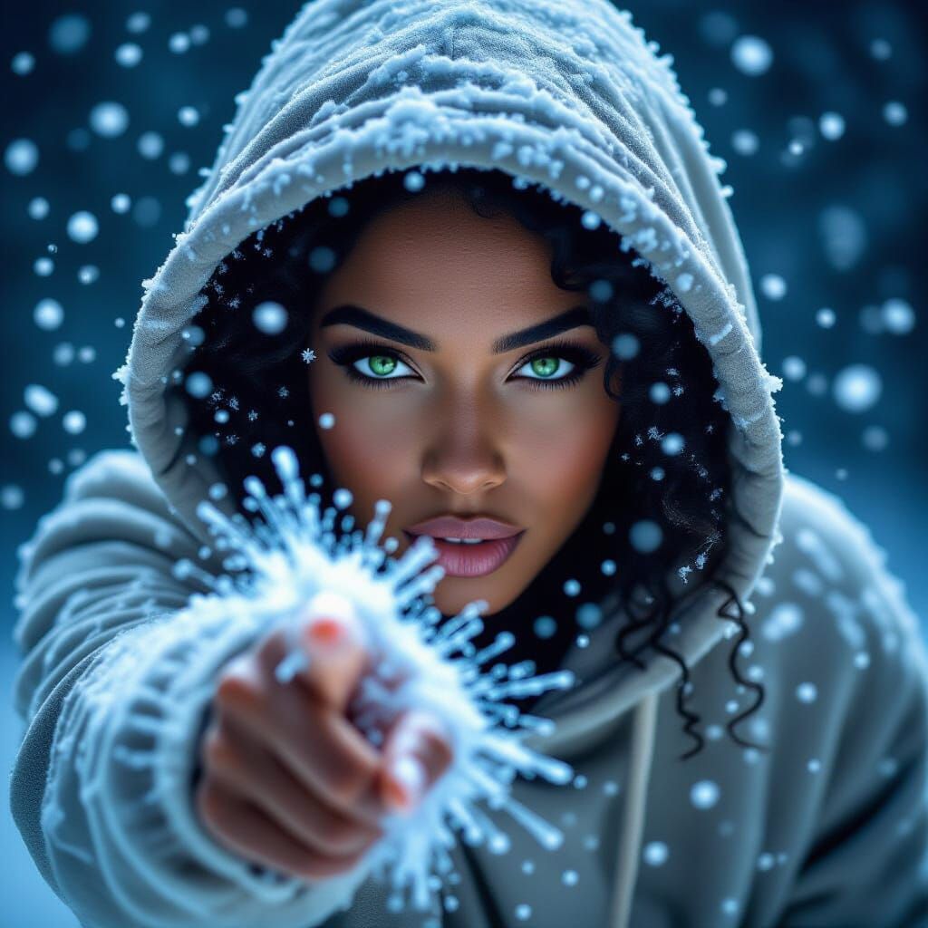 This striking image captures a close-up of an African woman with green eyes, her hoodie covered in ice. Her arm appears as a dramatic ice explosion, set against a dark background with cold lighting.