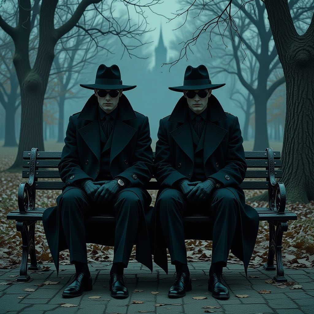 Zdzisław Beksiński. Two handsome goth men sit on a park bench, trench coats, wearing dark glasses and fadora hats. Dark and surreal atmosphere, intricate details, unsettling imagery, distorted figures, nightmarish landscapes. Dramatic lighting casts long shadows, enhancing the eerie mood. Deep colors ...