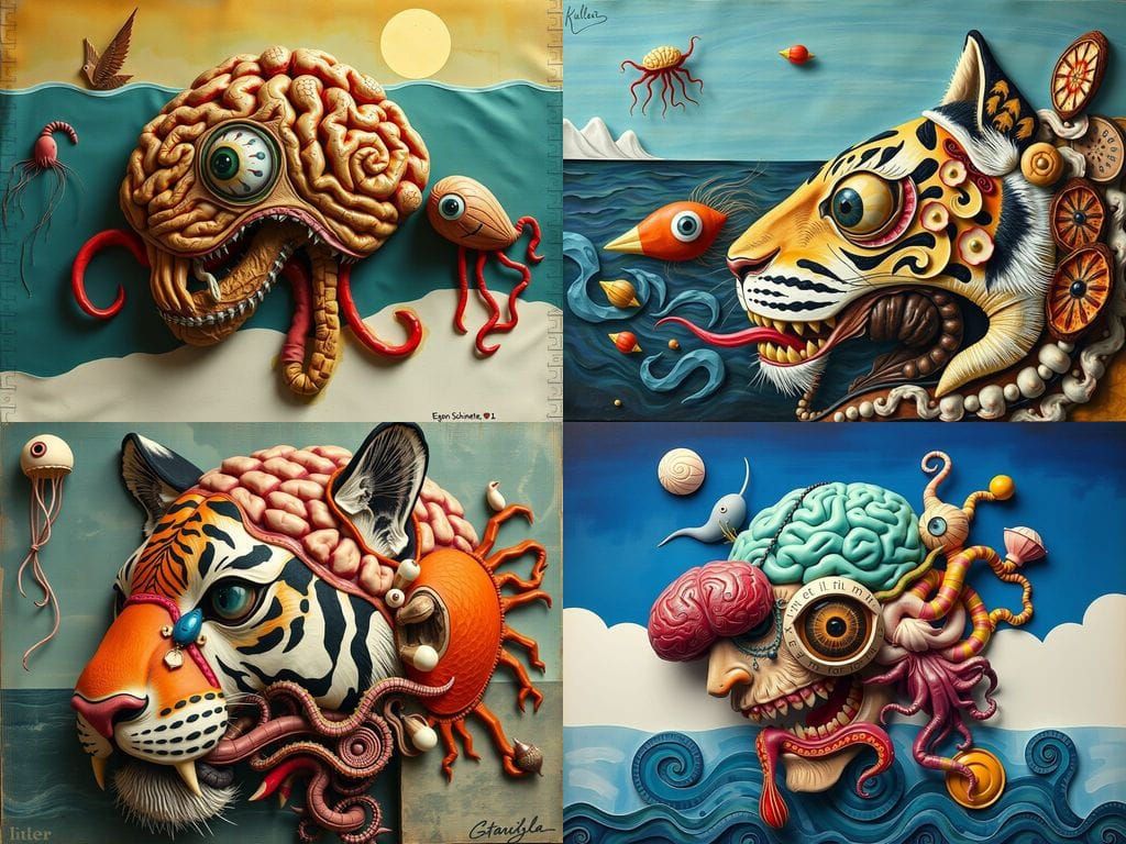 This image depicts a nightmarish scene of mutant organs in squalor, with elements of a tiger, jellyfish, and ocean, rendered in a mixed-media 3D style with painted paper collage.