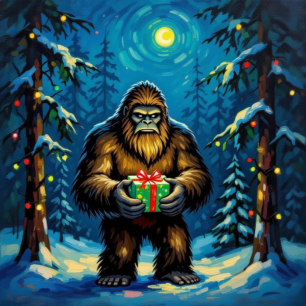 This image shows a hairy Sasquatch in a pine forest, holding a Christmas gift. The scene is illuminated by festive lights, rendered with thick, textured brushstrokes in a vibrant, expressive style.