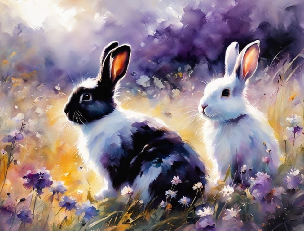 This image depicts two adorable fluffy bunnies amidst a vibrant field bursting with purple flowers under bright sunshine, rendered with intricate details and a colorful, cinematic quality.