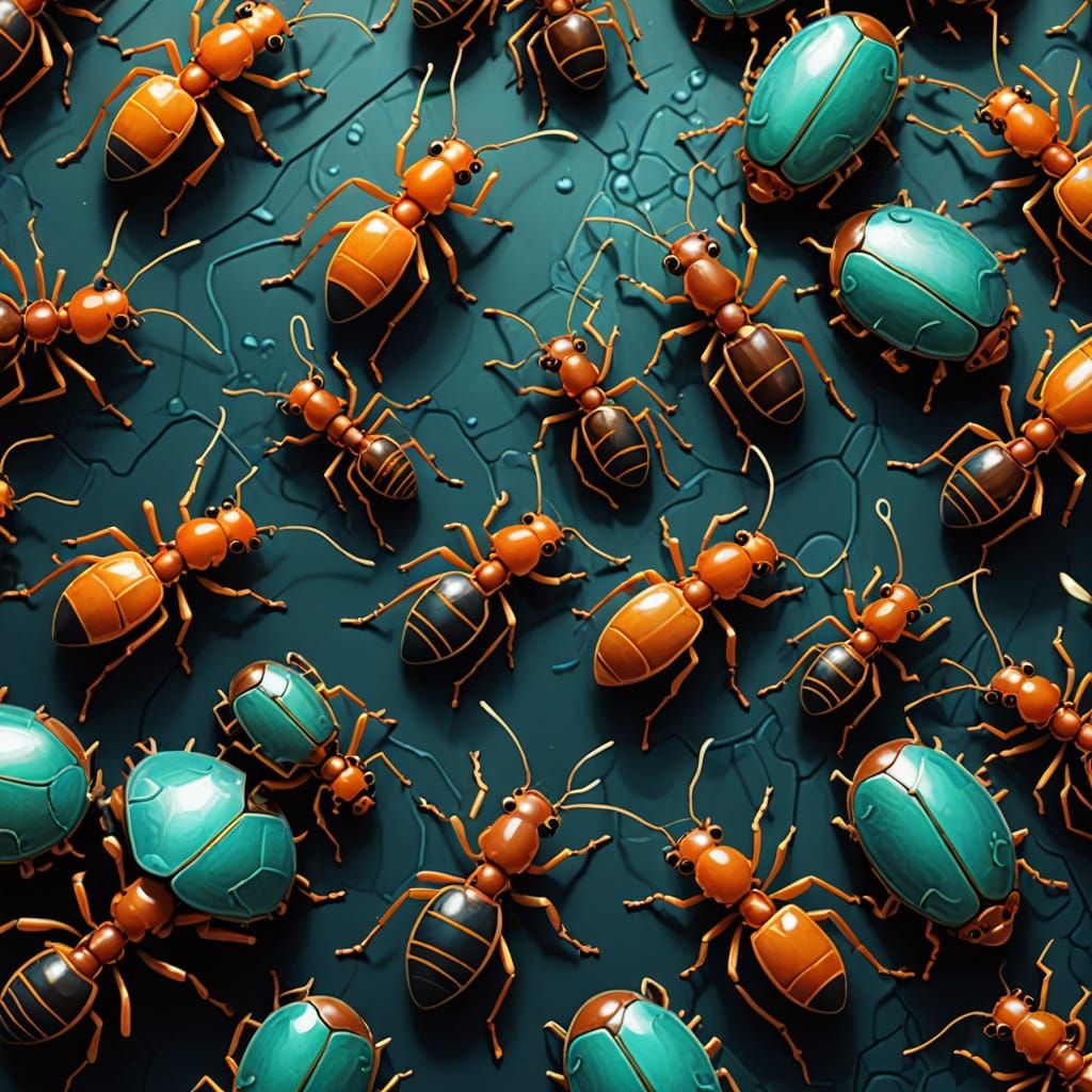 This hyperdetailed image features ants cleverly disguised as other insects, rendered in a photorealistic, abstract style with intricate patterns and a metallic sheen, using saturated, complementary colors and dramatic lighting.