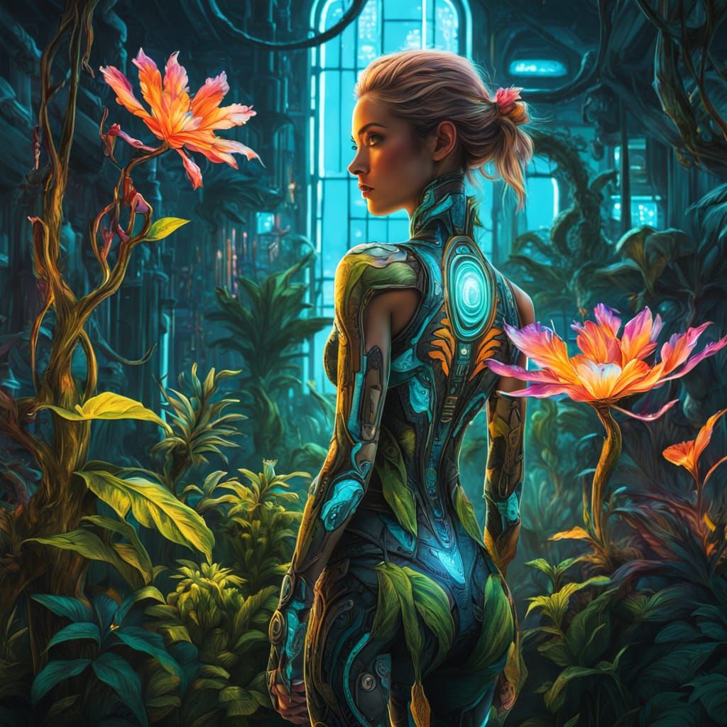 A vibrant digital painting shows a confident, futuristic plant-human hybrid in her laboratory. The image features glowing tattoos, luminous eyes and neon flowers amidst lush jungle vegetation.