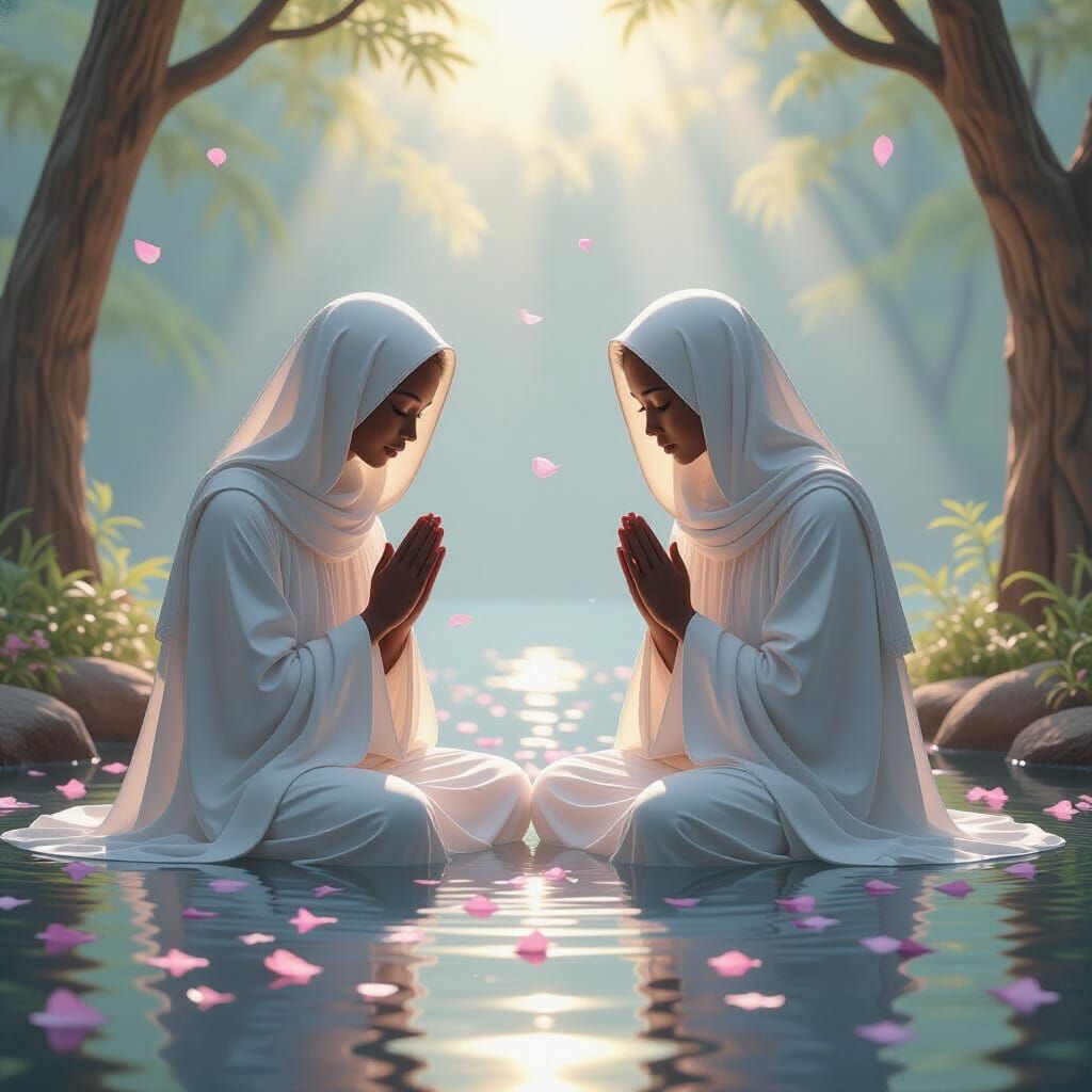 This image shows a spiritual portrait of individuals in a Senegalese style, bathed in pale light. Rendered with soft, soothing colors and high detail, it conveys profound patience and serenity.