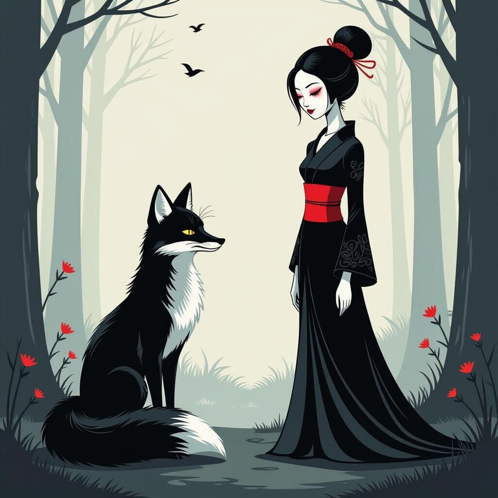This image shows a tall, thin Asian woman accompanied by a black fox. The scene evokes a dark and eerie atmosphere, rendered in a whimsical style.