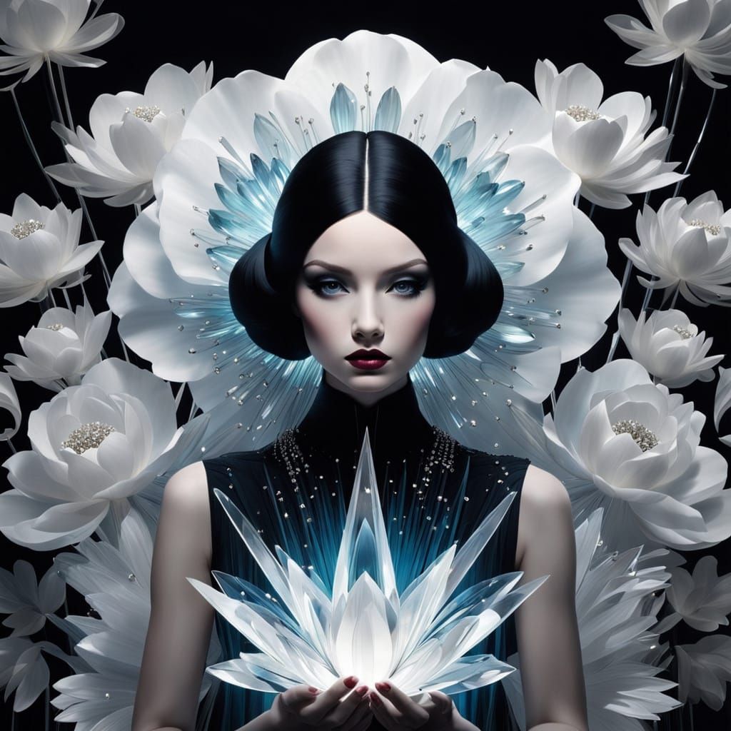 This image showcases a vibrant pop art deco composition featuring crystalline clear flowers with psismatic lighting, blending retro futuristic and art deco elements in a unique visual display.