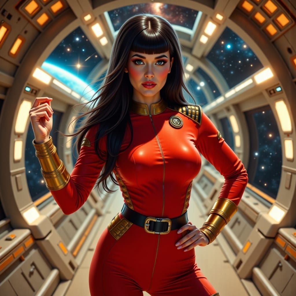 A glamorous pin-up character with Cleopatra-inspired hair poses in a retro-futuristic starship corridor. The scene features a Star Trek-like uniform and a view of space through a portal, rendered in warm interior lighting.