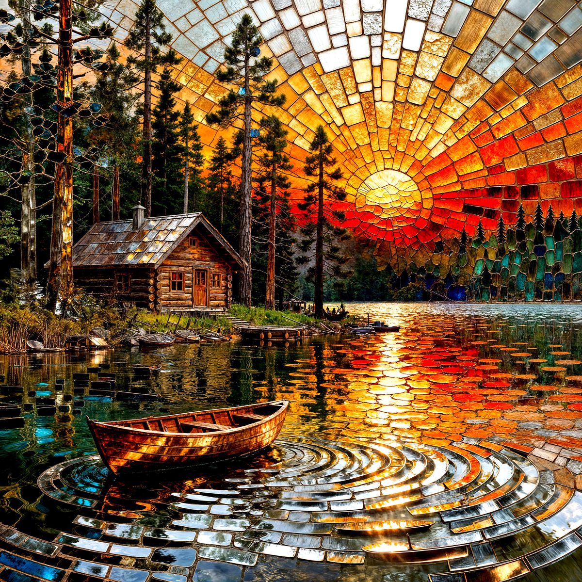 This image showcases a serene forest lake at sunrise, featuring a rustic cabin and pine trees. Rendered in a colorful embossed metal relief style, it mimics handcrafted metallic textures and vibrant, molten-like colors.