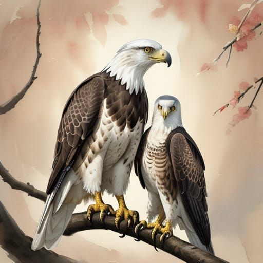 This image shows a majestic bald eagle and peregrine falcon on a branch, rendered in soft watercolor washes with detailed feathers and natural tones. The serene forest backdrop is illuminated by golden hour light.