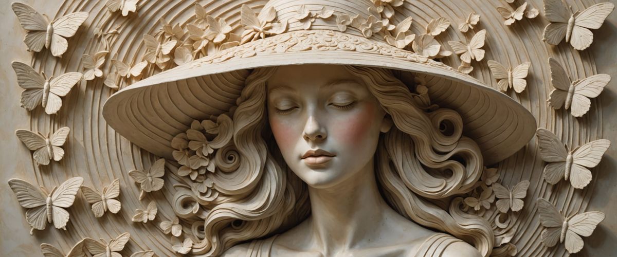A high-relief plaster sculpture of a young woman wearing a sun hat. The artwork, painted in pastel tones, features textured spiral patterns and delicate butterflies, creating an ethereal atmosphere.