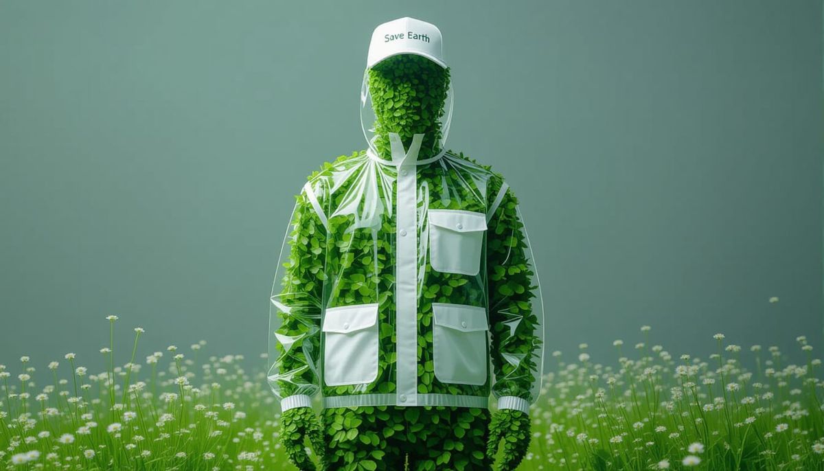 A human figure made of plants and wildflowers wears a transparent rain jacket and baseball cap against a grey background. Ethereal lighting blends nature and fashion.