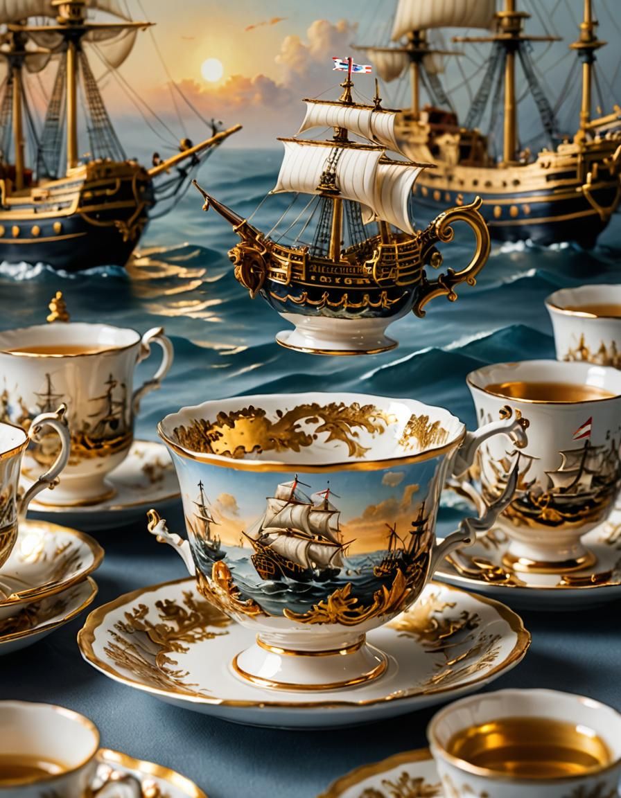 A miniature 18th-century naval battle between French and British frigates unfolds inside a teacup, rendered as an oil painting on porcelain. Warm light and soft colors enhance the delicate brushstrokes.