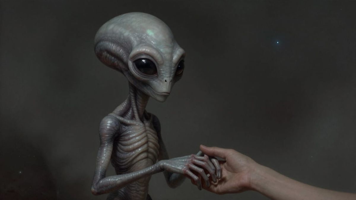 This digital painting depicts a surreal encounter between a grey alien and a human, evoking cosmic horror with a muted palette and bioluminescent accents. The image conveys a profound sense of dread and connection.