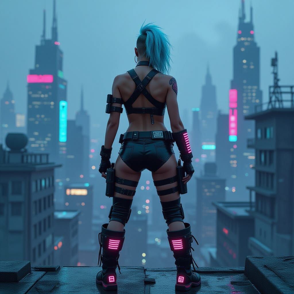 A cyberpunk rogue with turquoise undercut hair stands on a gritty rooftop overlooking a neon wasteland city. She wears an asymmetric latex top, leather shorts, and spiked boots in a futuristic aesthetic.