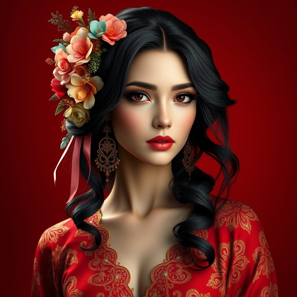 A stunning portrait of a beautiful woman in a sumptuous red gown with intricate golden filigree, adorned with colorful flowers and delicate ribbons, set against a bold red backdrop with striking accessories and hyper-realistic details, blending elegance and opulence in a triadic color scheme.