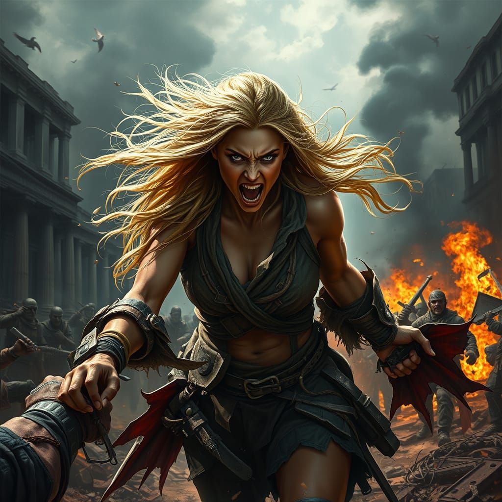 This image shows a determined warrior with long golden hair battling humans amidst a chaotic, fire-swept battlefield. The scene features dramatic lighting, debris, and smoke, rendered in a hyper-realistic, cinematic style.