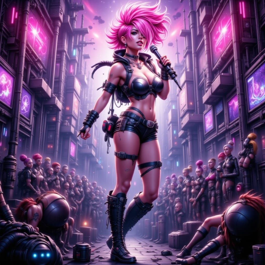 This image shows a cyberpunk rockstar girl performing on an epic stage. The well-endowed performer with short pink hair is holding a microphone and pouring her soul into the music in a cyberpunk aesthetic.