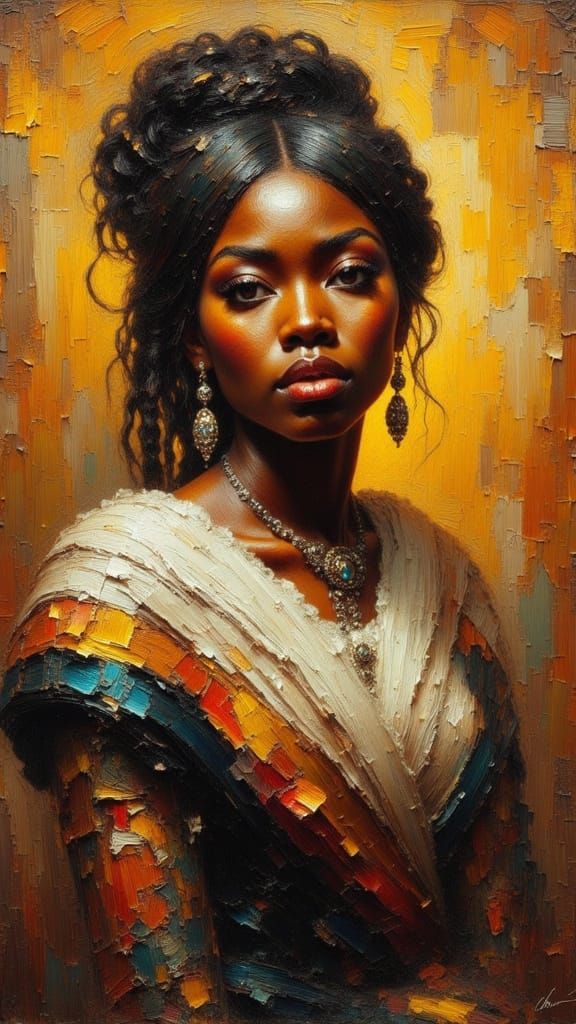 This image shows a portrait of a beautiful African woman from the 1800s. The artwork is rendered as an impasto painting with a somewhat grungy aesthetic.